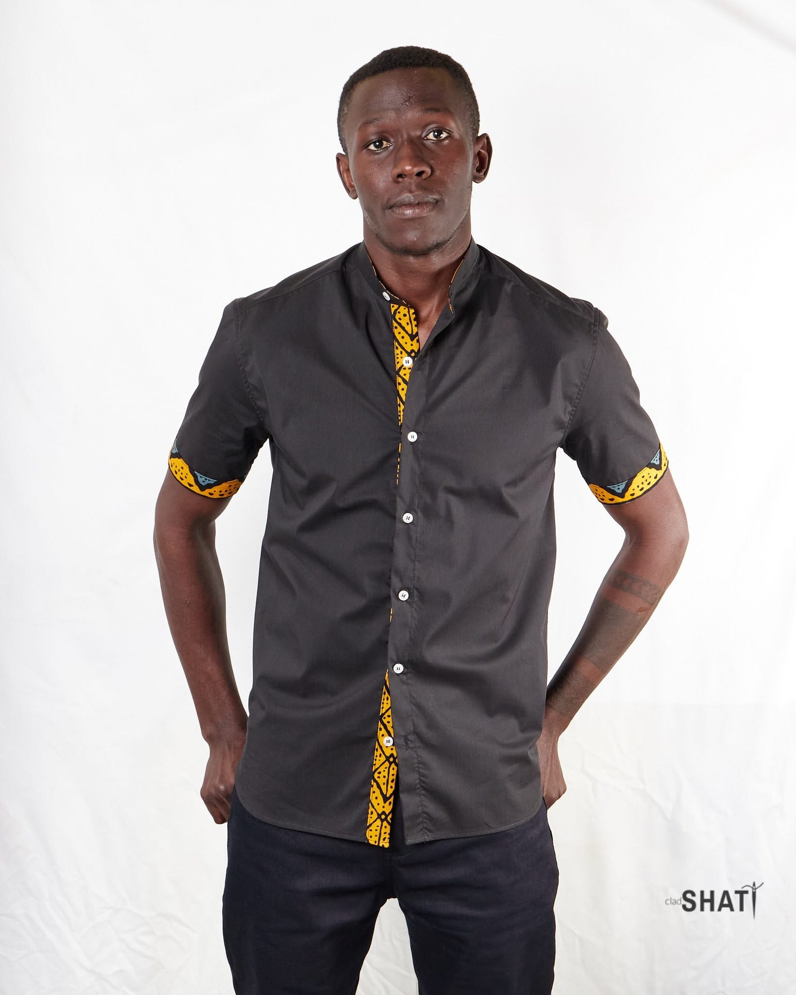 Celebrate style with our Black Chinese Collar short sleeve kitenge Ankara button-down shirt, a perfect blend of sophistication and cultural heritage. This shirt brings together the rich textures of the traditional African Ankara fabric and the minimalist elegance of a Chinese collar design, creating a versatile wardrobe essential that stands out in both casual and formal settings.