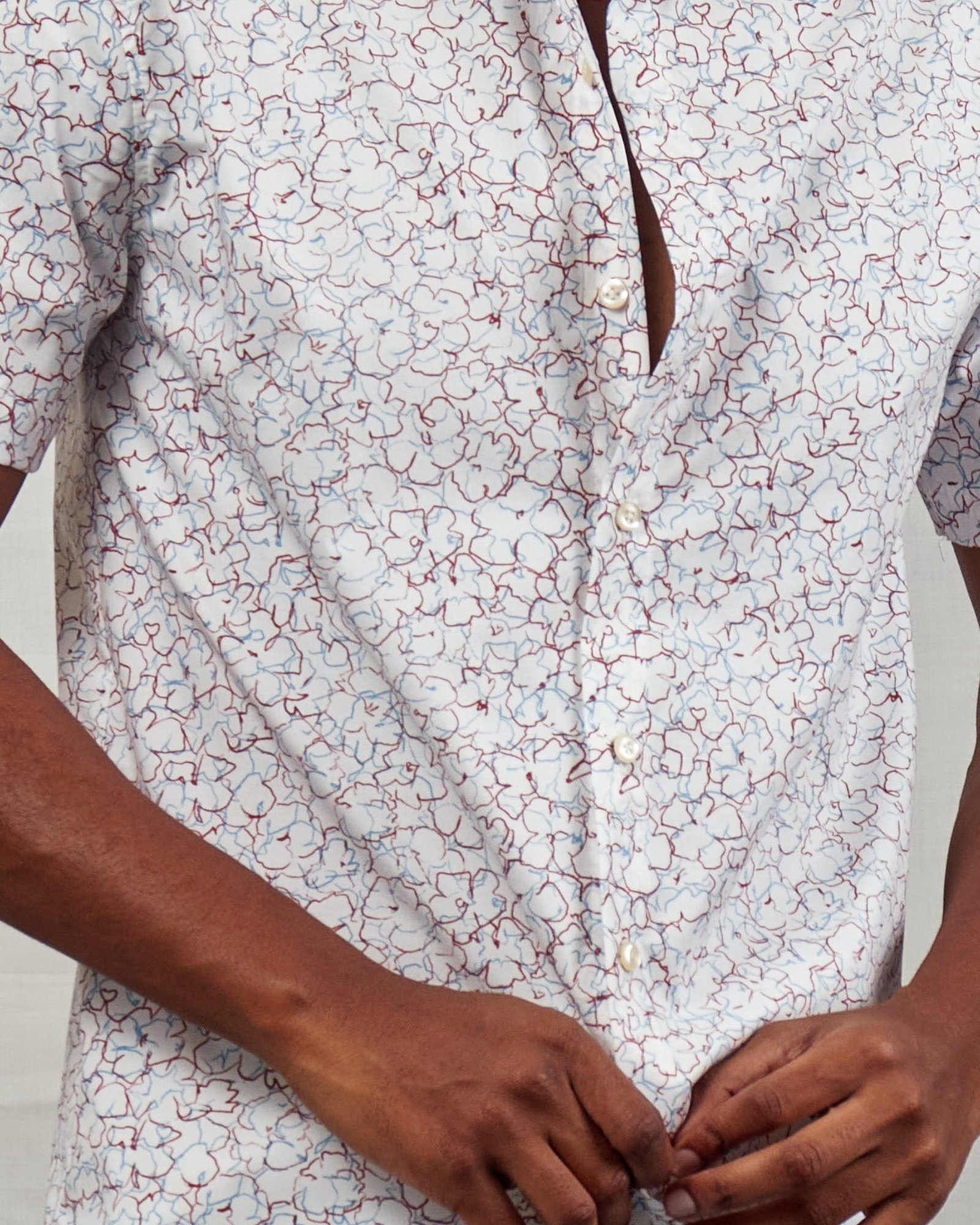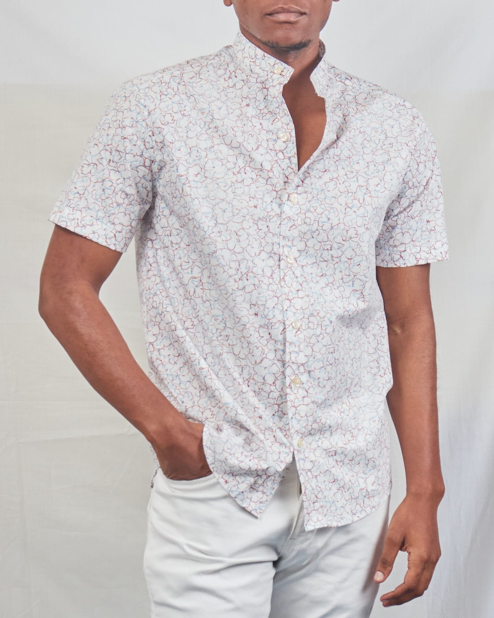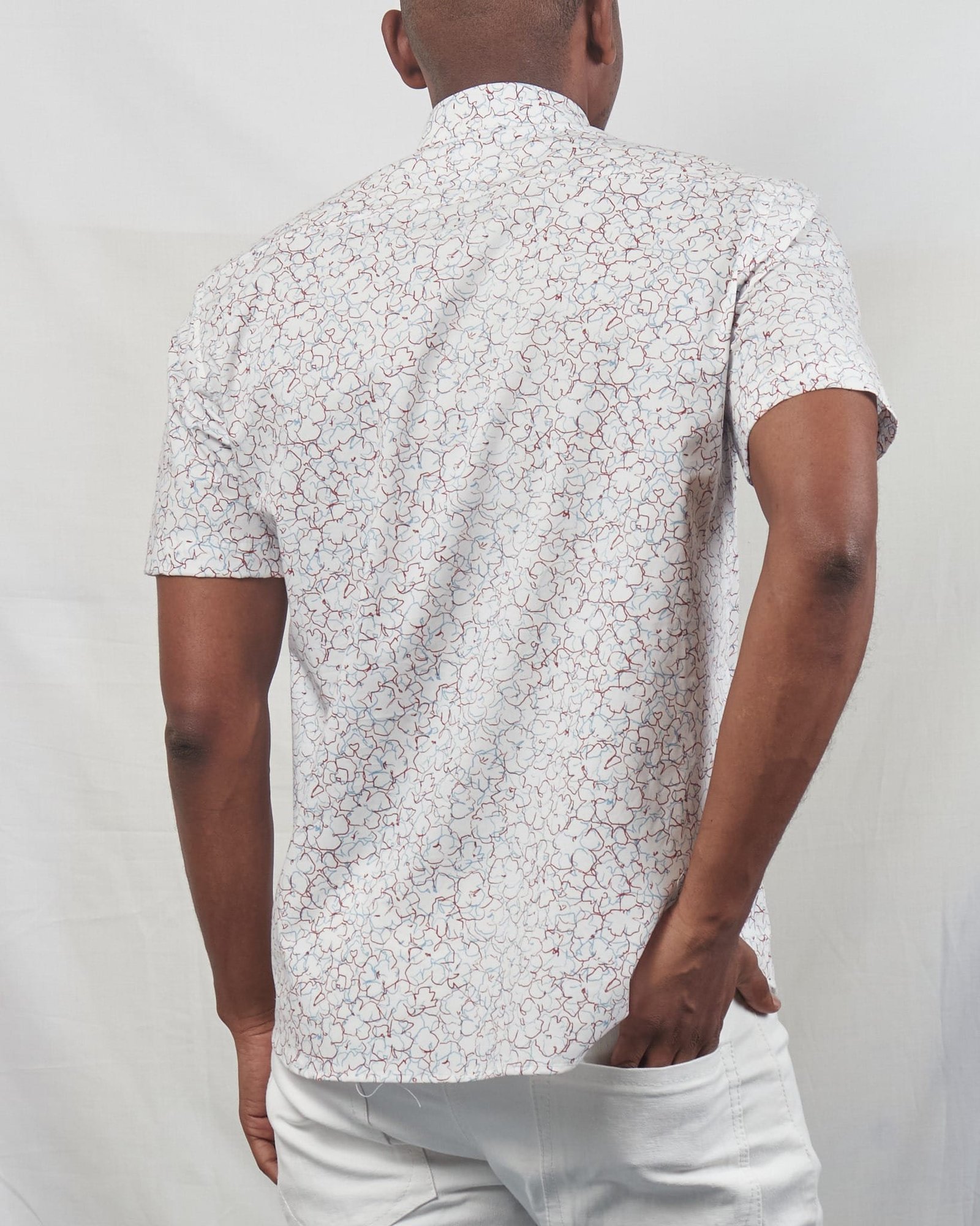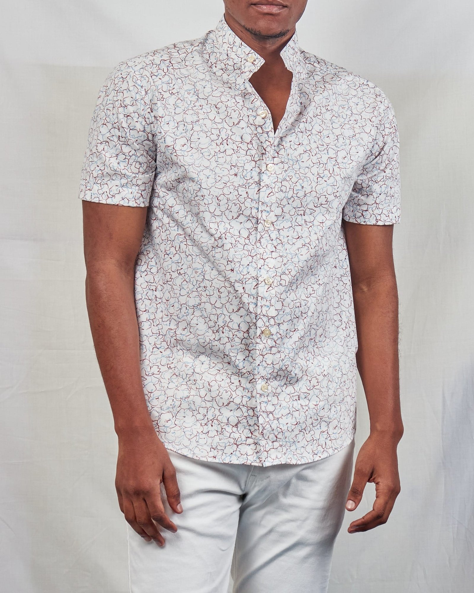 If you’re looking to upgrade your wardrobe with something fresh and stylish, the all-over maroon floral outline print short sleeved button-down shirt for men is the ultimate choice.