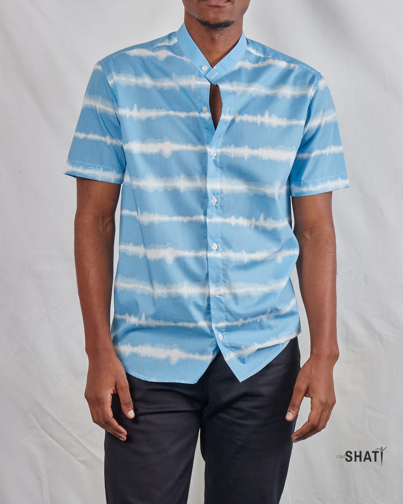 A fresh twist on timeless style, this Sky Blue & White Horizontal Striped Shirt combines breezy comfort with sleek sophistication. Featuring a classic Chinese (Mandarin) collar and short sleeves, it’s perfect for adding a refined yet relaxed touch to your warm-weather wardrobe.