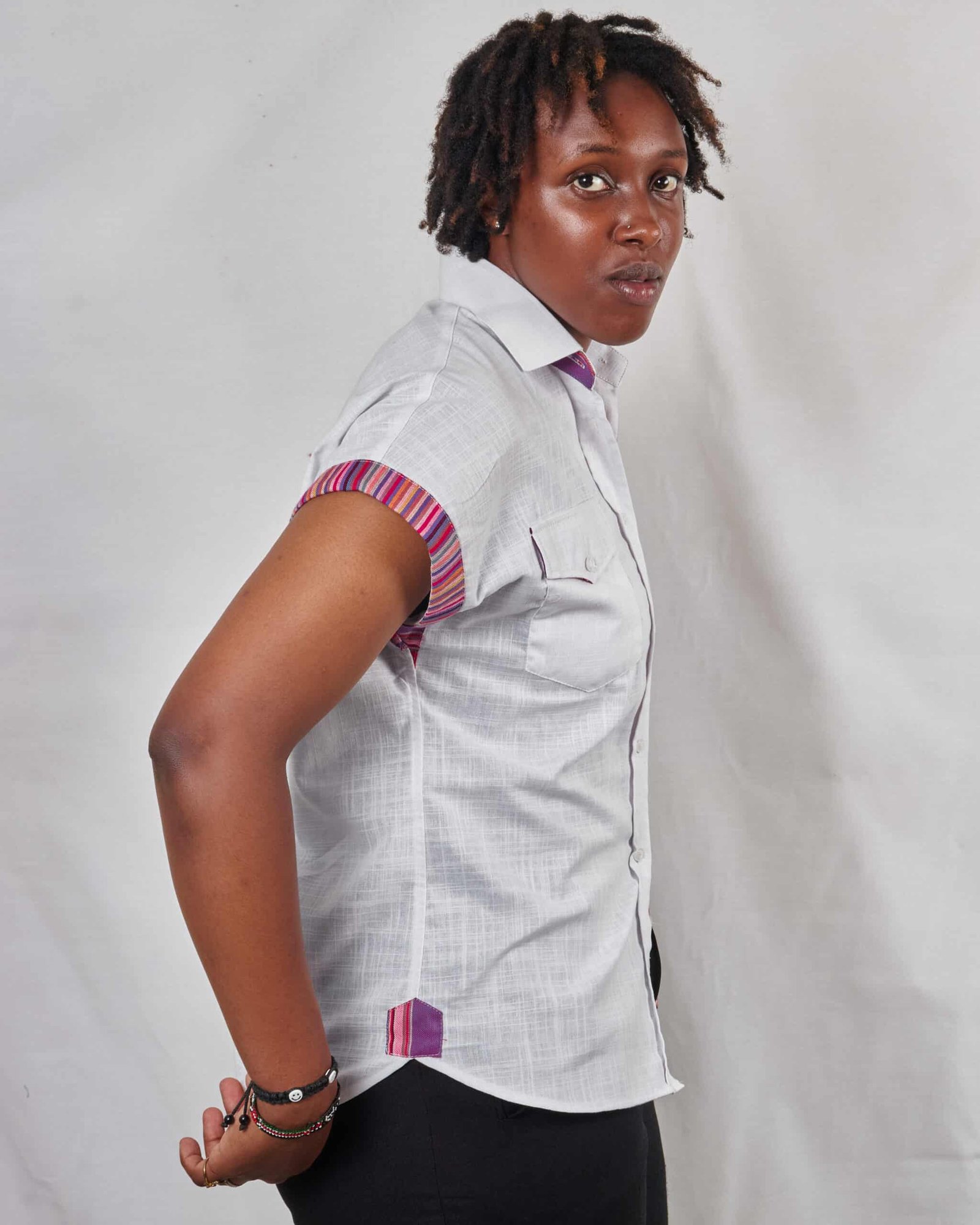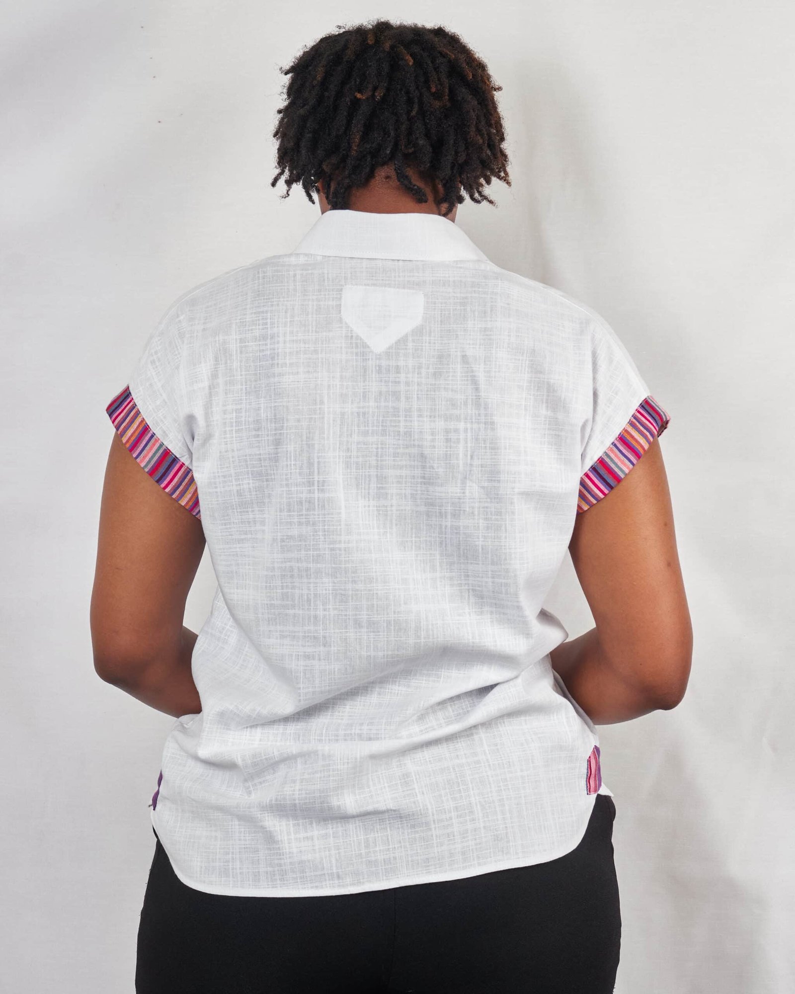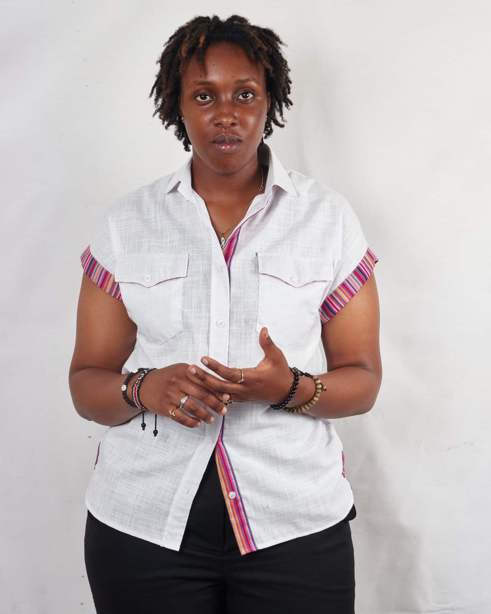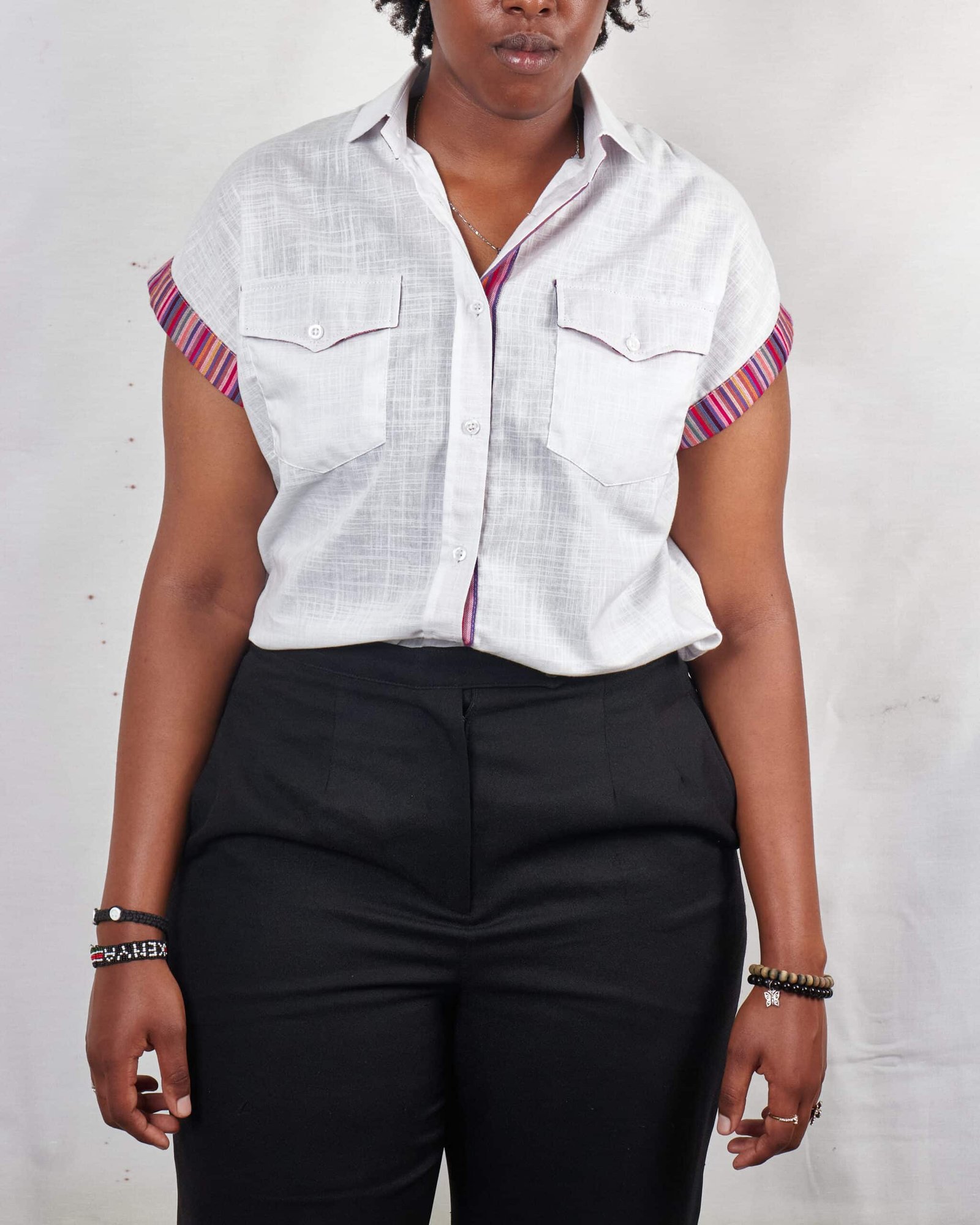 Crafted for the woman who moves through life with grace and intention, this shirt is a celebration of artisanal texture and contemporary design. We’ve taken the vibrant, Kenyan spirit of traditional Kikoy fabric and blended it with the breathable, lightweight luxury of linen. The result? A drape that feels like a second skin.