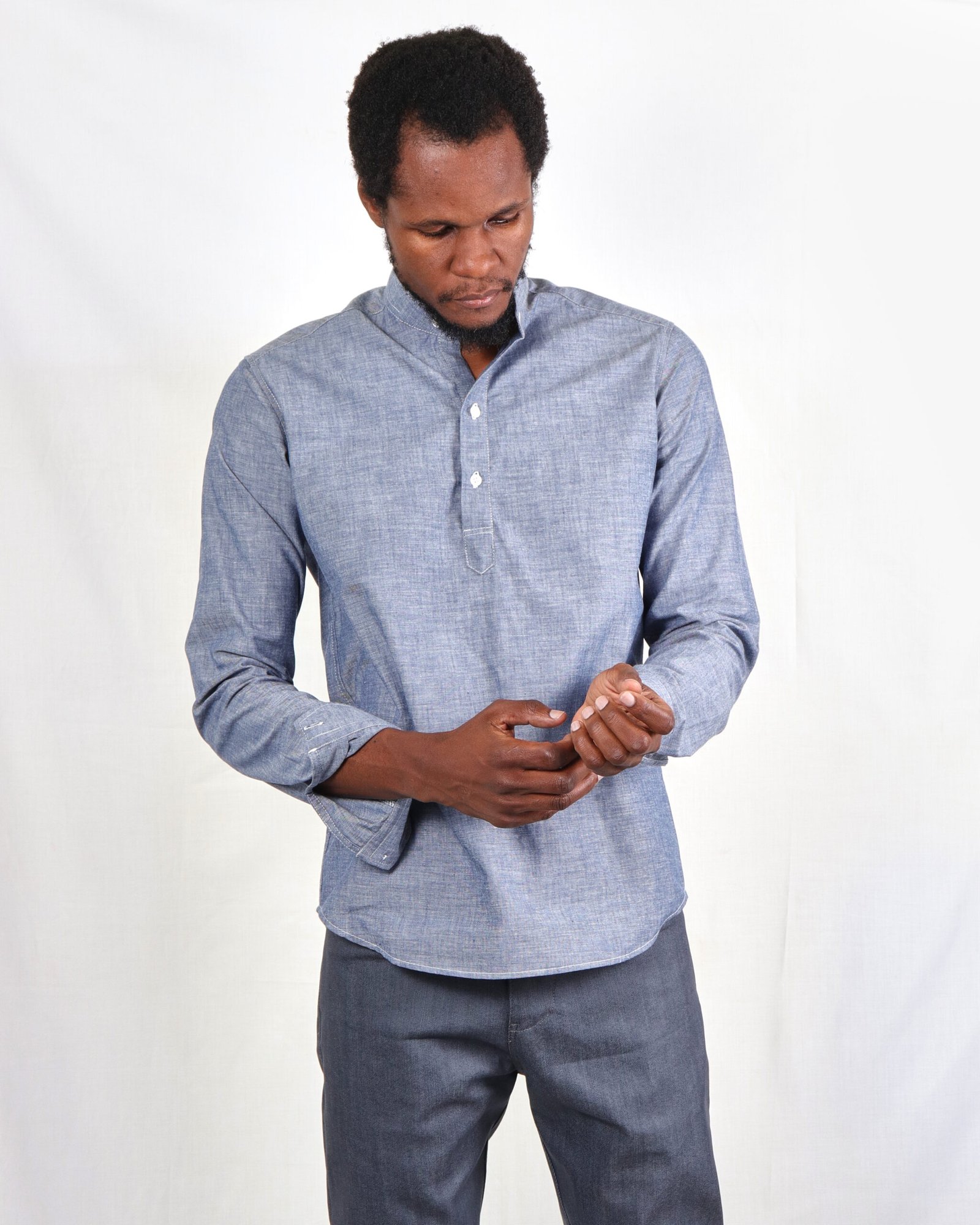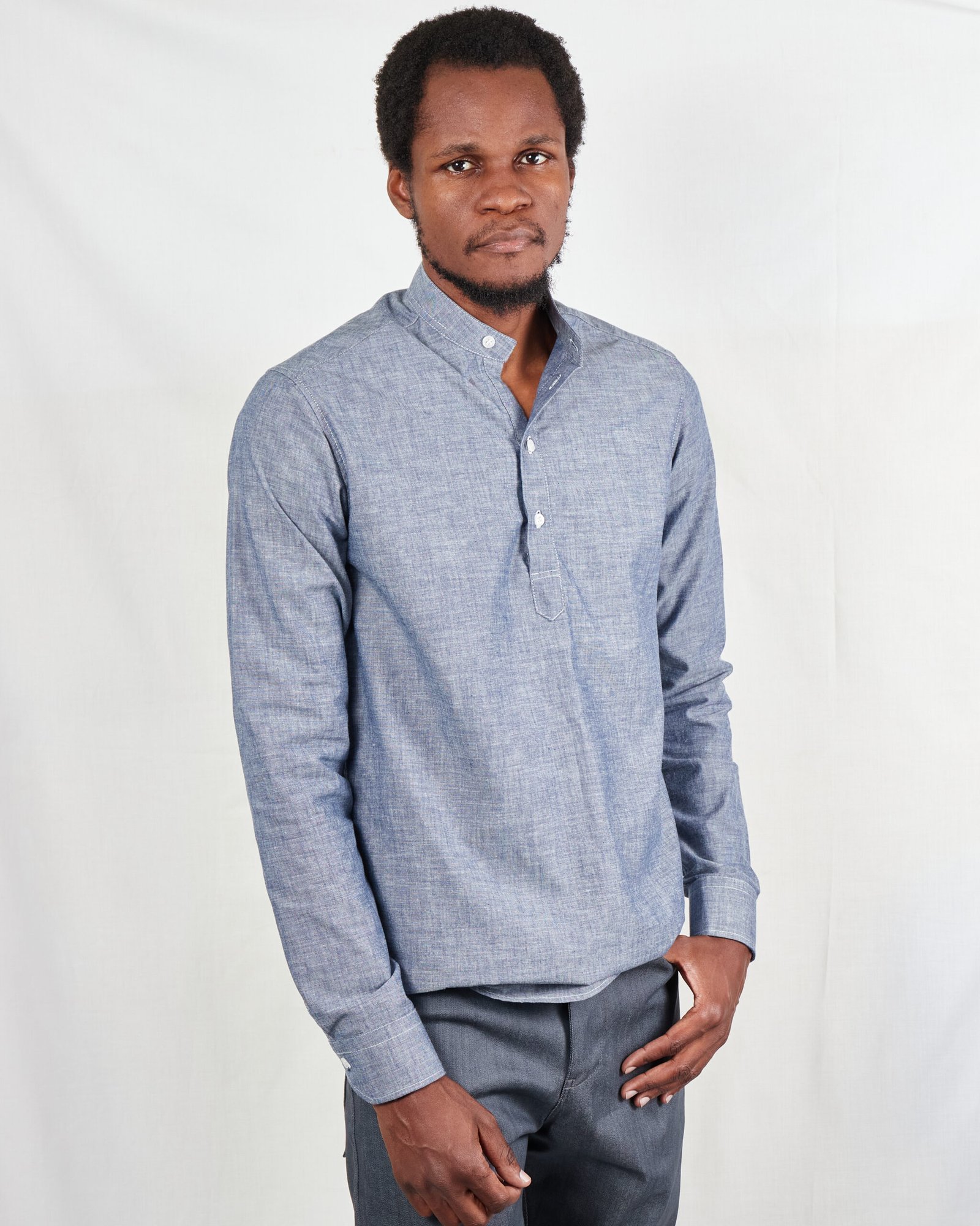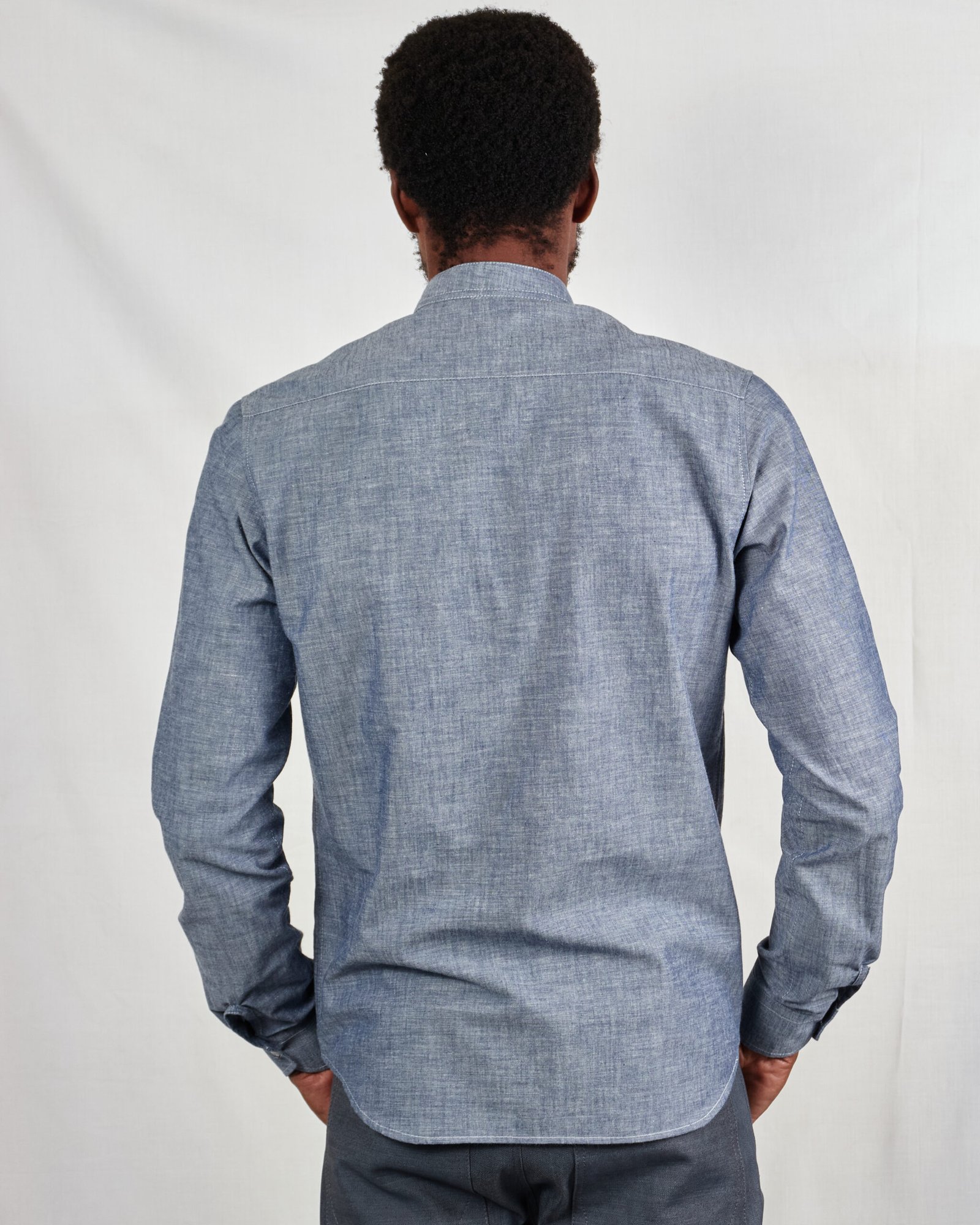 We’ve selected a 100% premium cotton chambray that is both lightweight and resilient. Known for its soft hand-feel and breathable nature, this fabric provides all-day comfort with the distinctive, slightly textured appearance chambray is loved for. It’s the ideal weight for year-round wear, working as a standalone piece in warmer months and a perfect layering piece under sweaters and jackets when the temperature drops.
