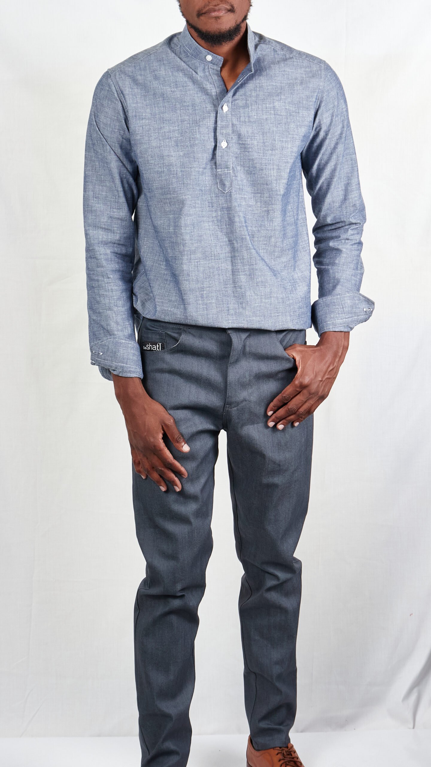 Step into a shirt that redefines versatile elegance. Designed with a clean, architectural line, this long-sleeved chambray shirt cuts away the unnecessary—starting with the pockets. The result is a smooth, streamlined front that offers a polished look, whether worn tucked in or out.