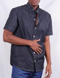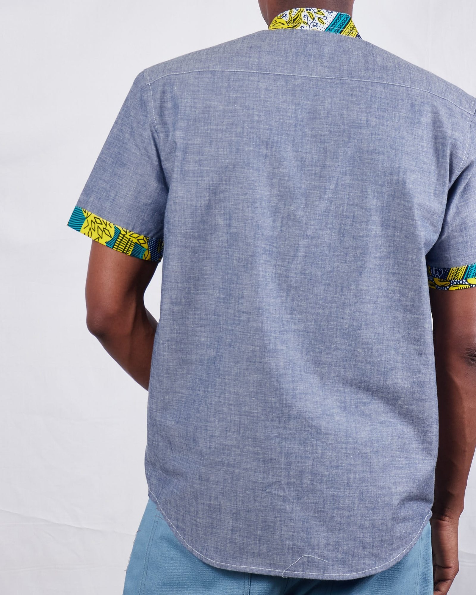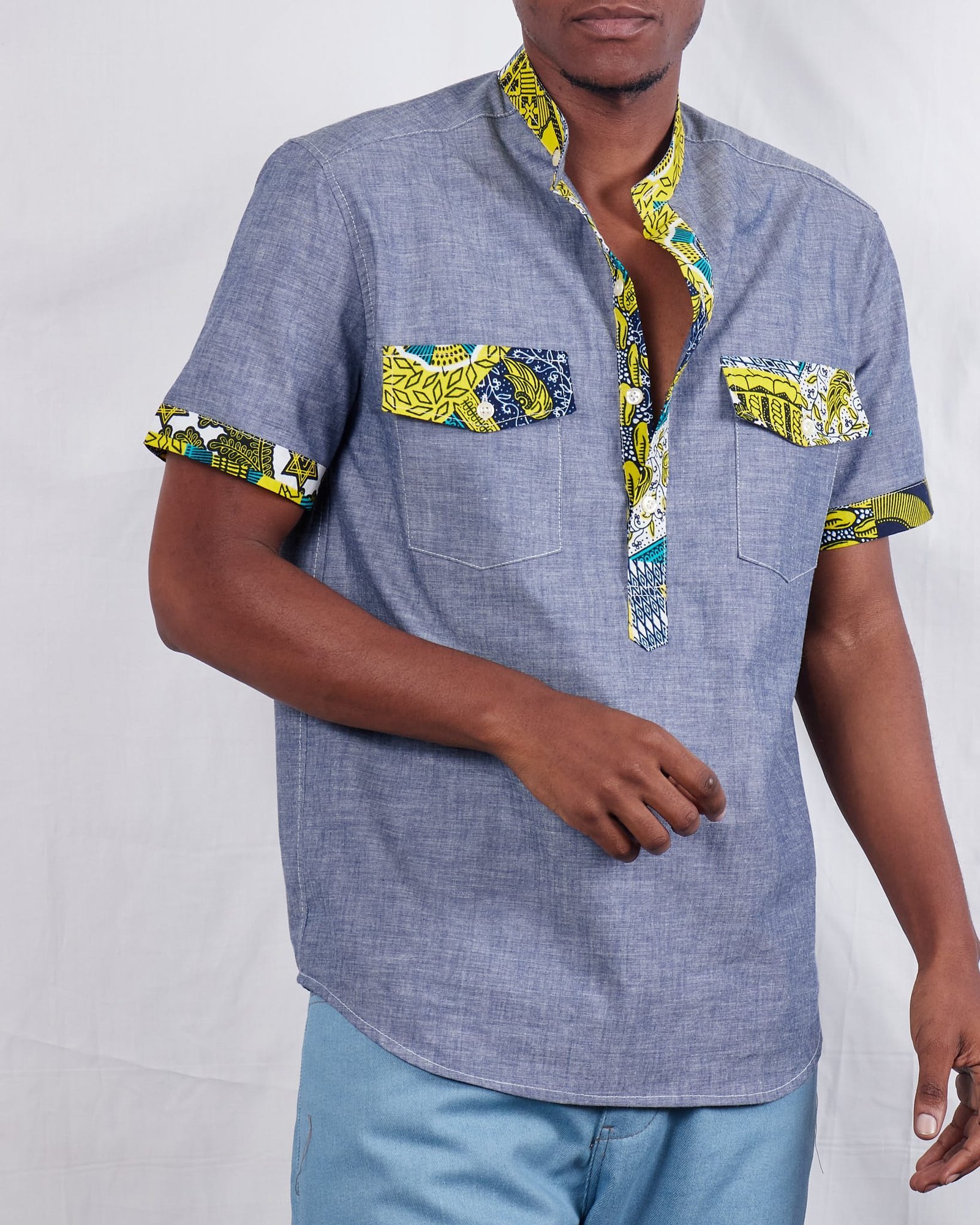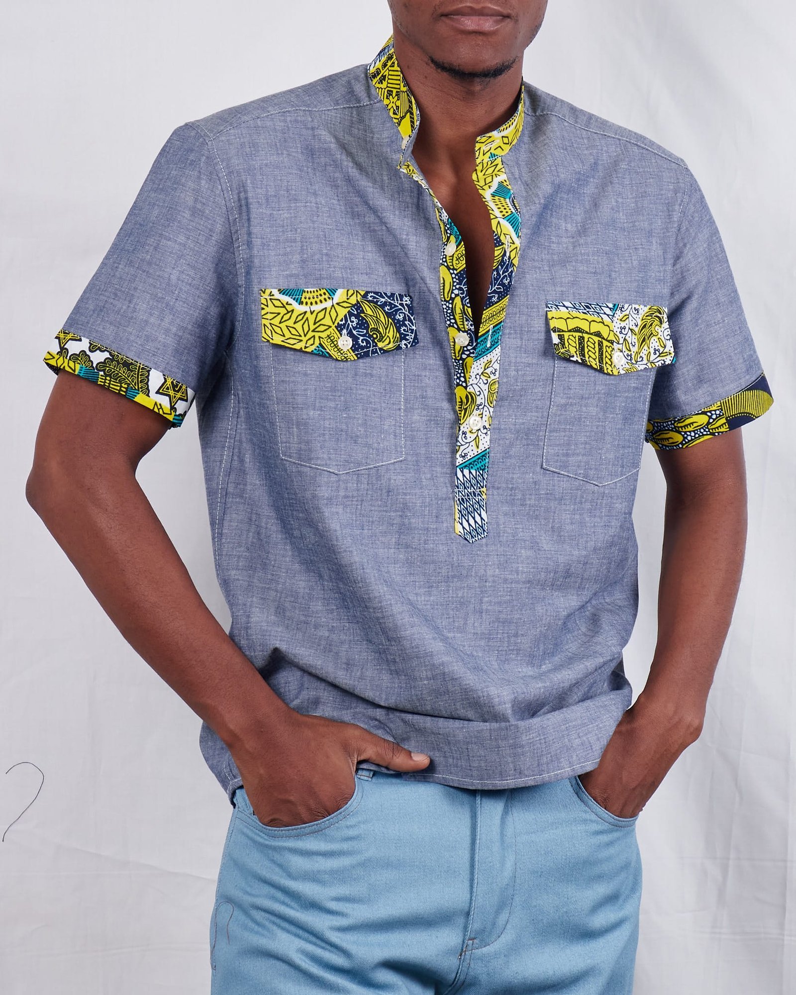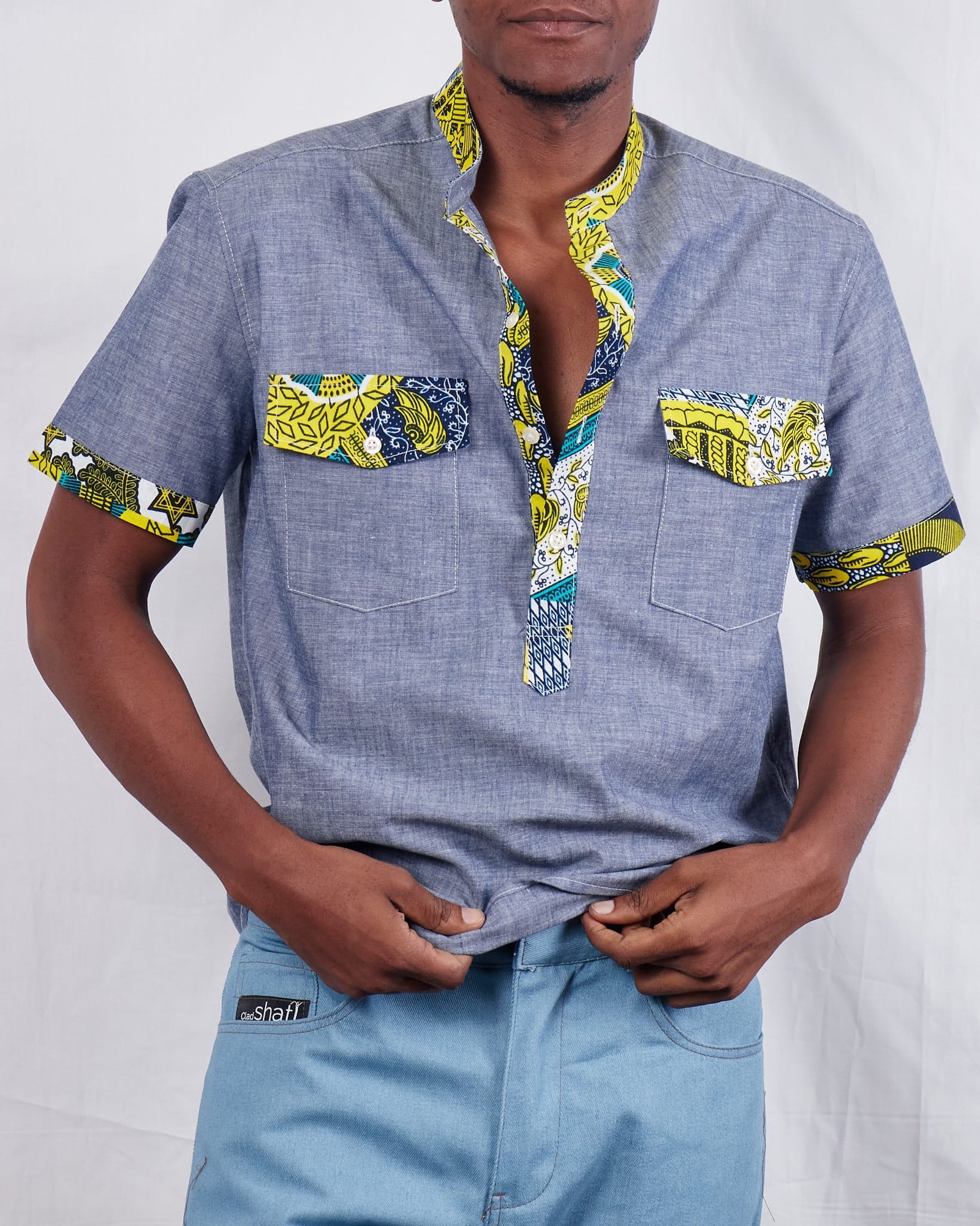 Elevate your style with this unique fusion of contemporary tailoring and African heritage. Our short-sleeved chambray shirt features a half-plaquette design for a sleek, modern look, enhanced by vibrant Kitenge print accents that celebrate bold African aesthetics.