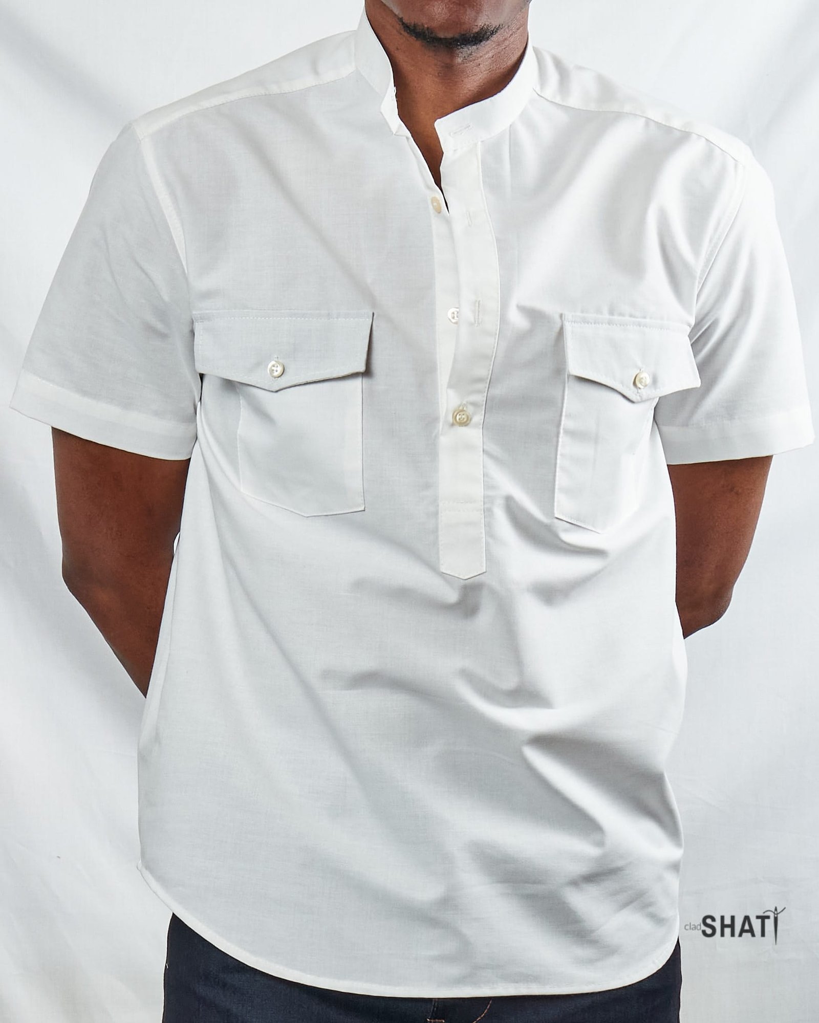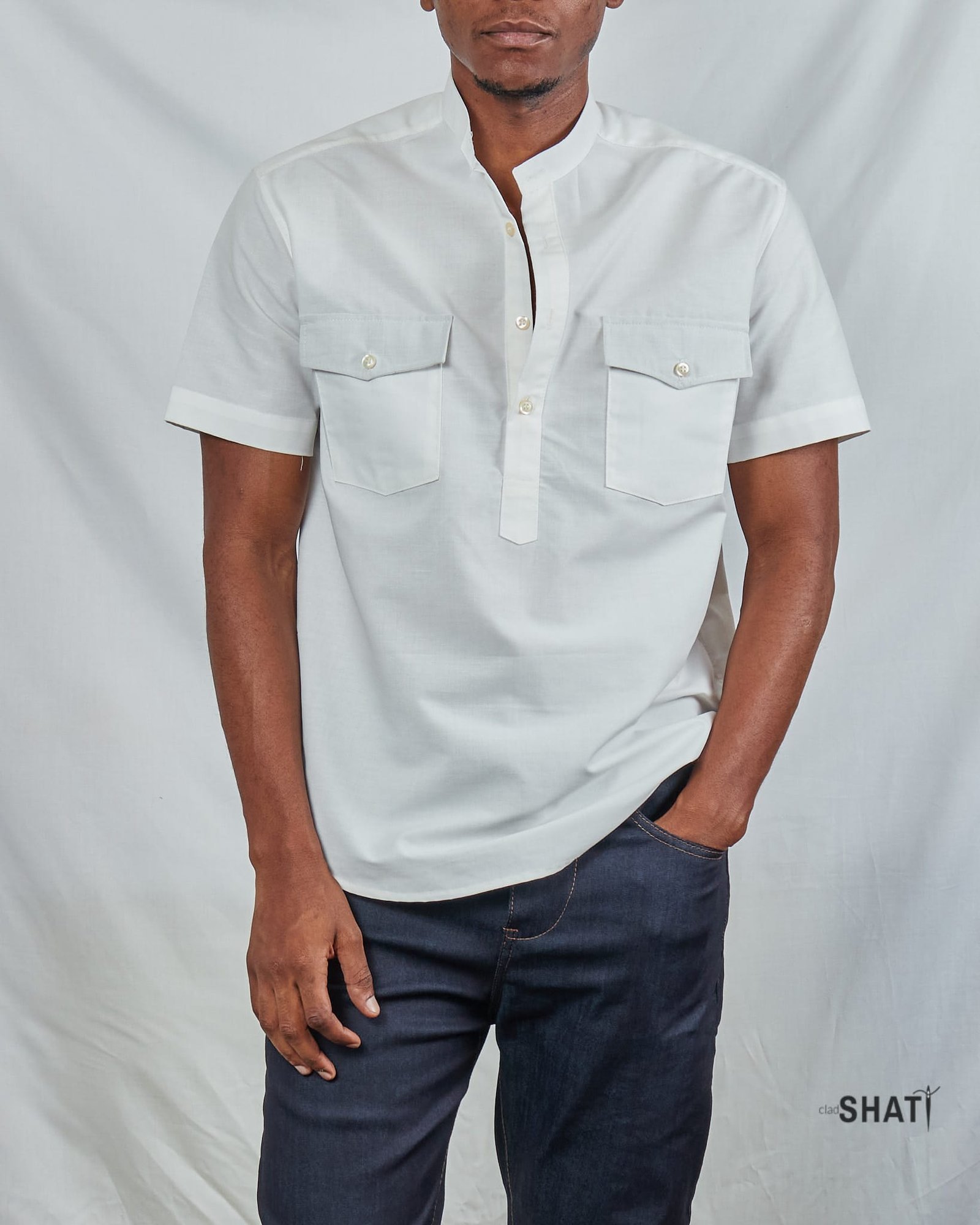 Meet your new wardrobe essential—the Two-Pocket Popover Chinese Collar White Shirt. Designed for those who appreciate clean lines and functional style, this short-sleeved shirt blends modern minimalism with timeless appeal.