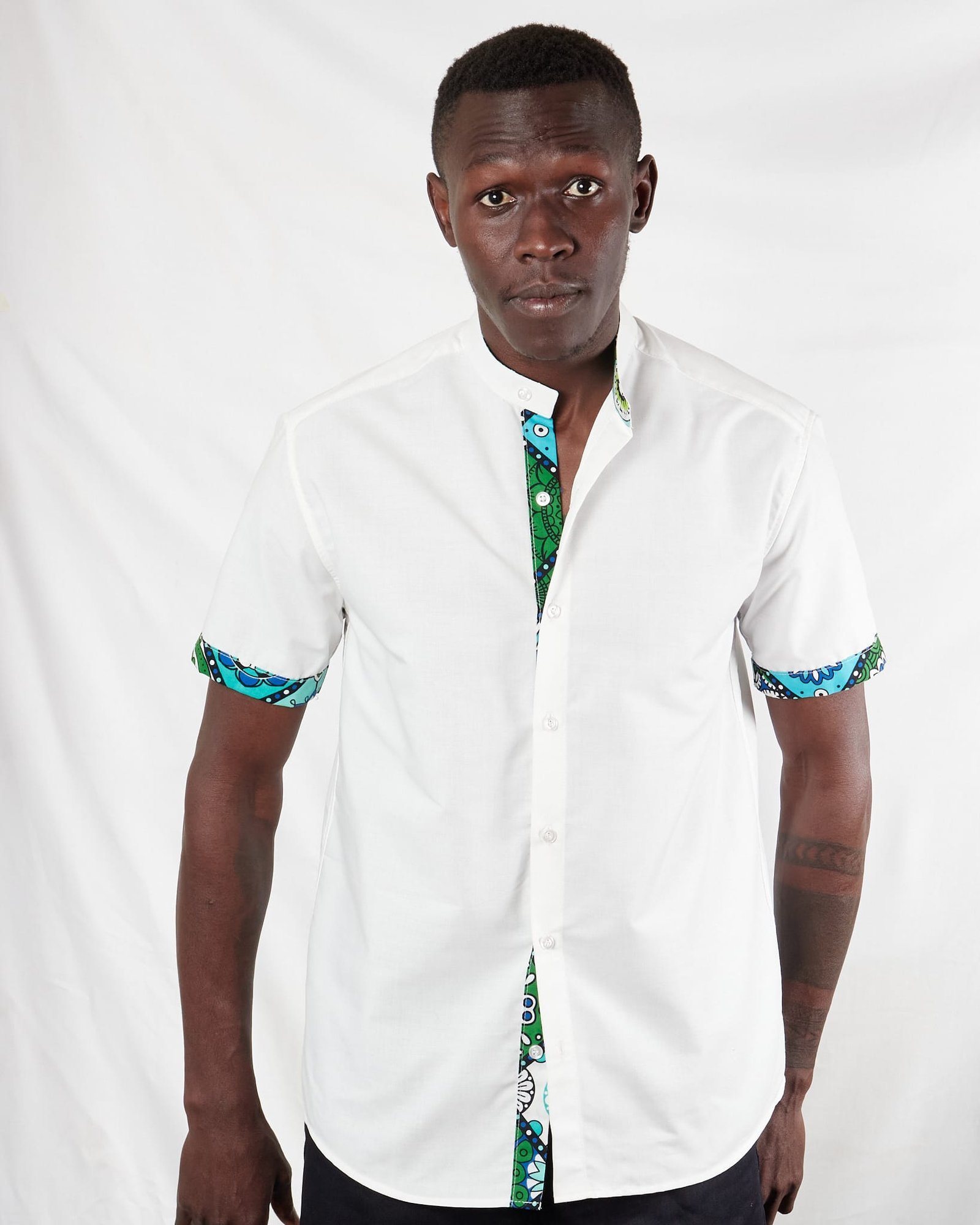 Crafted from high-quality Ankara Kitenge fabric, this short sleeve shirt feels as good as it looks. The breathable material ensures comfort during warm weather while maintaining its durability for long-term wear. The crisp white base enhances the intricate patterns of the Ankara Kitenge fabric, creating a striking yet balanced look. Designed with attention to detail, the soft texture of the shirt ensures easy movement and all-day comfort—ideal for versatile wear, whether at work or leisure.