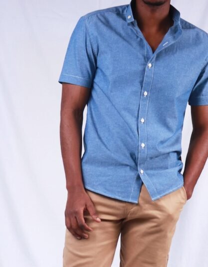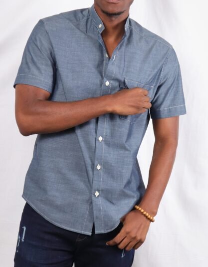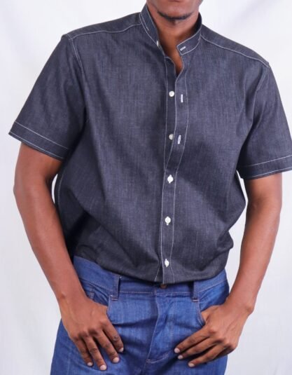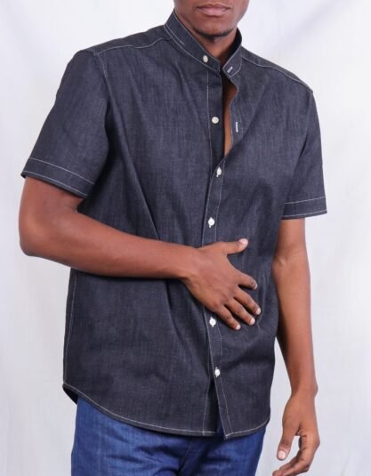 Men’s Black Short-Sleeved Chinese Collar Denim Shirt