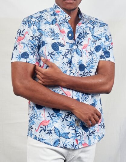 Stylish Comfort: Blue Pink Flamingo Chinese Collar Button Down Shirt for Men