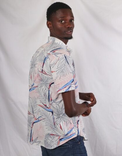 Modern Black & White Floral Print Short Sleeve Mens Shirt with Chinese Collar