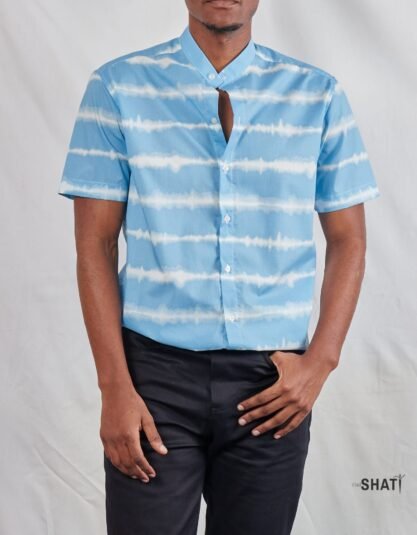 Sky Blue & White Horizontal Striped Short Sleeve Chinese Collar Men’s Summer Shirt
